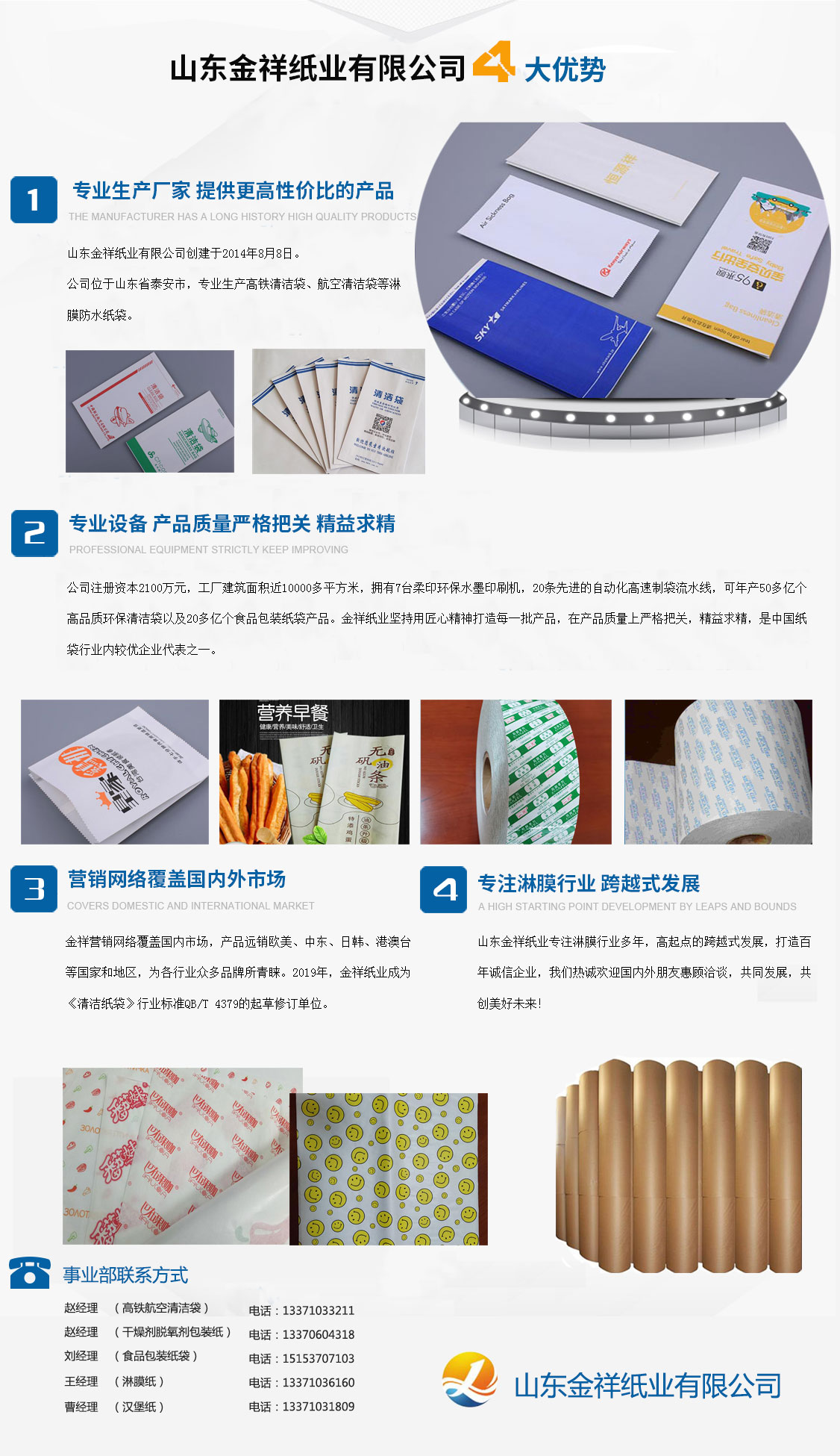 山東金祥紙業(yè)有限公司創(chuàng)建于2014年8月8日,公司位于山東泰安,專(zhuān)業(yè)生產(chǎn)高鐵清潔袋、航空清潔袋等淋膜防水紙袋。公司注冊(cè)資本2100萬(wàn)元,工廠(chǎng)建筑面積近10000多平方米,擁有7臺(tái)柔印環(huán)保水墨印刷機(jī),20條先進(jìn)的自動(dòng)化高速制袋流水線(xiàn),可年產(chǎn)50多億個(gè)高品質(zhì)環(huán)保清潔袋以及20多億個(gè)食品包裝紙袋產(chǎn)品。金祥紙業(yè)堅(jiān)持用匠心精神打造每一批產(chǎn)品,在產(chǎn)品質(zhì)量上嚴(yán)格把關(guān),精益求精,是中國(guó)紙袋行業(yè)內(nèi)較優(yōu)企業(yè)代表之一。金祥營(yíng)銷(xiāo)網(wǎng)絡(luò)覆蓋國(guó)內(nèi)市場(chǎng),產(chǎn)品遠(yuǎn)銷(xiāo)歐美、中東、日韓、港澳臺(tái)等國(guó)家和地區(qū),為各行業(yè)眾多品牌所青睞。2019年,金祥紙業(yè)成為《清潔紙袋》行業(yè)標(biāo)準(zhǔn)QB/T 4379的起草修訂單位。